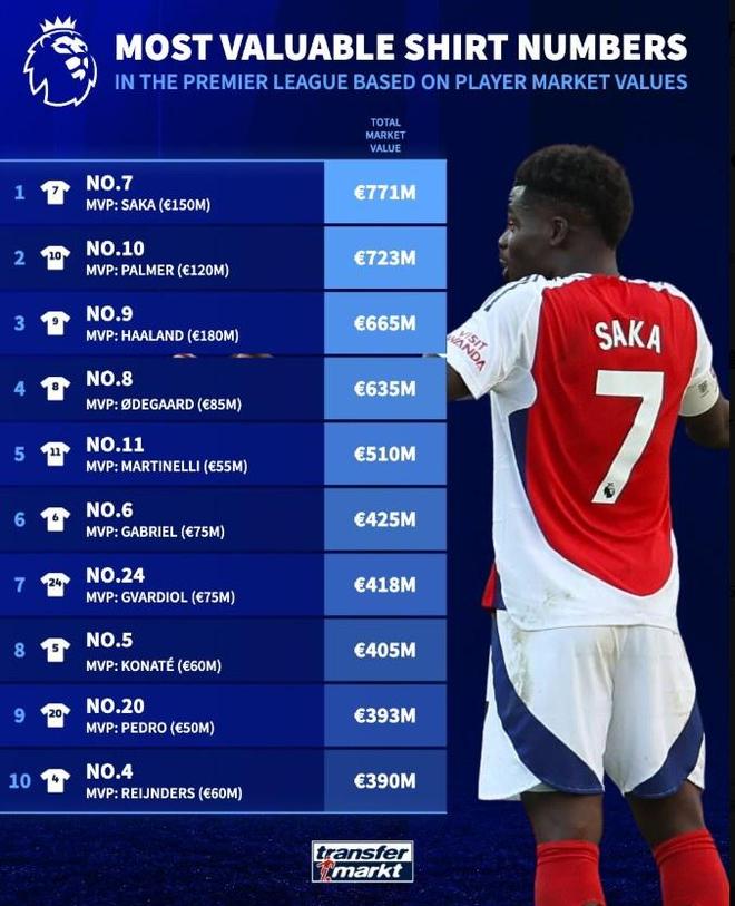 英超联赛T衬衫数字市场价值排名:第7号萨卡的总