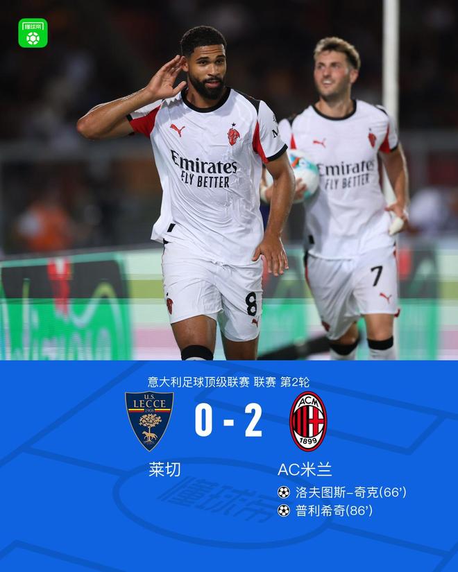 8月30日,在意大利足球联赛的第二轮比赛中,LECCE在家中面对AC米兰。在比赛中,AC米兰球员在进攻中收到一支球队的传球后冷静地开枪,帮助球队领先。然后,Pulisic在比赛结束时打进了另一个进球,扩大了球队的得分优势。最后,AC米兰以2-0击败LECCE赢得了比赛。在关键赛事的第67分钟,莫德里克(Modric)任意球,埃夫斯(Efast)在第88分钟以1-0得分,以1-0获胜,帕尔西奇(Pulicich)得分,米兰(Milan)2-0,在球场上以2-0的胜利,比赛开始于第五分钟。后者在35分钟内因痛苦而陷入困境,Loftus小鸡准备通过守门员,并在第45分钟被后者解决。圣地亚哥在第50分钟失利,球丢失。战斗时,萨尔马克(Salmark)在第61分钟就跌入了标志,圣地亚哥(Santiago)得分,但最初被认为是无效的。在第67分钟,莫德里克(Modric)任意球,洛夫图斯(Loftus)女孩在第72分钟以1-0取得了米兰的得分,Fofana以1-0射击,当地的守门员Falcone在第76分钟储蓄得分,而Santiago被捕得太多,并在第78分钟死亡。在第88分钟阻止胜利的情况下,Purisic得分,节省了米兰队以2-0对齐的技术统计数据。